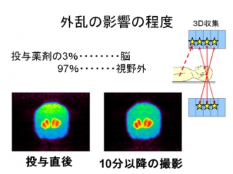本研究で用いた線条体ファントム(fluke Biomedical社製)は組織等価の頭蓋骨、脳実質部分、線条体部分を含む形状をしており、解剖学的に正確な位置に設計している。このファントムを用いて収集法の違いによる画質の検討を行った結果、信号量の少ない領域での2D収集ではノイズが多く定量性が保てないのに対し、3D収集ではノイズの少ない安定した画像を得ることができた。3D収集ではカメラの外に存在する薬剤からの放射線の影響を受けて画像が乱れるデメリットがあるが、この外乱の影響は外からの放射線によって、脳の上部に向けてPET値が高くなる現象を明らかにできた。また、外部からの放射線量減衰に伴って、この影響が指数的に小さくなり、投与数分後より影響が無視できるレベルになることが確認できた。